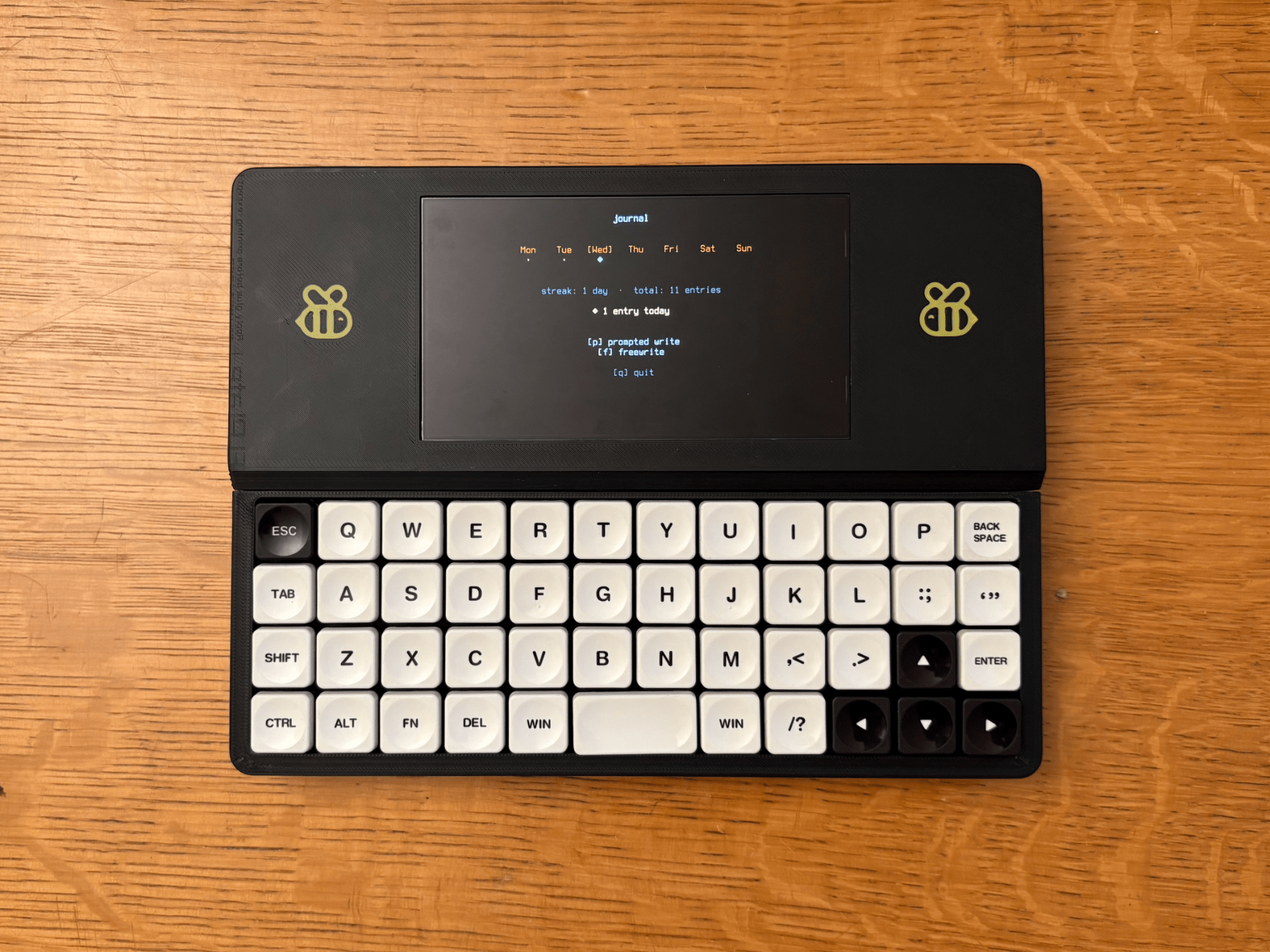 硬件是树莓派 Zero 2 W,搭一块 5.5 英寸 1280x720 AMOLED 屏,键盘用的是 Air40 矮轴正交键盘,外壳 3D 打印,整机蜜蜂主题涂装,挺好看的。